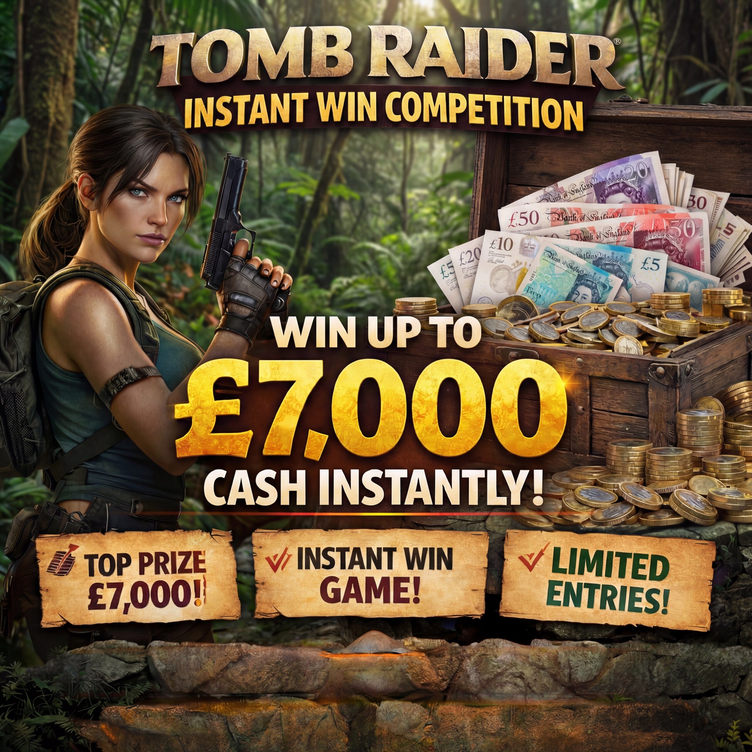 Get ready to uncover incredible prizes in our Tomb Raider instant win competition! For just £0.25 per entry, you could win up to £7,000 in cash instantly — plus be entered into the end prize draw! This is an exciting instant win format where you find out right away if you’re a winner.